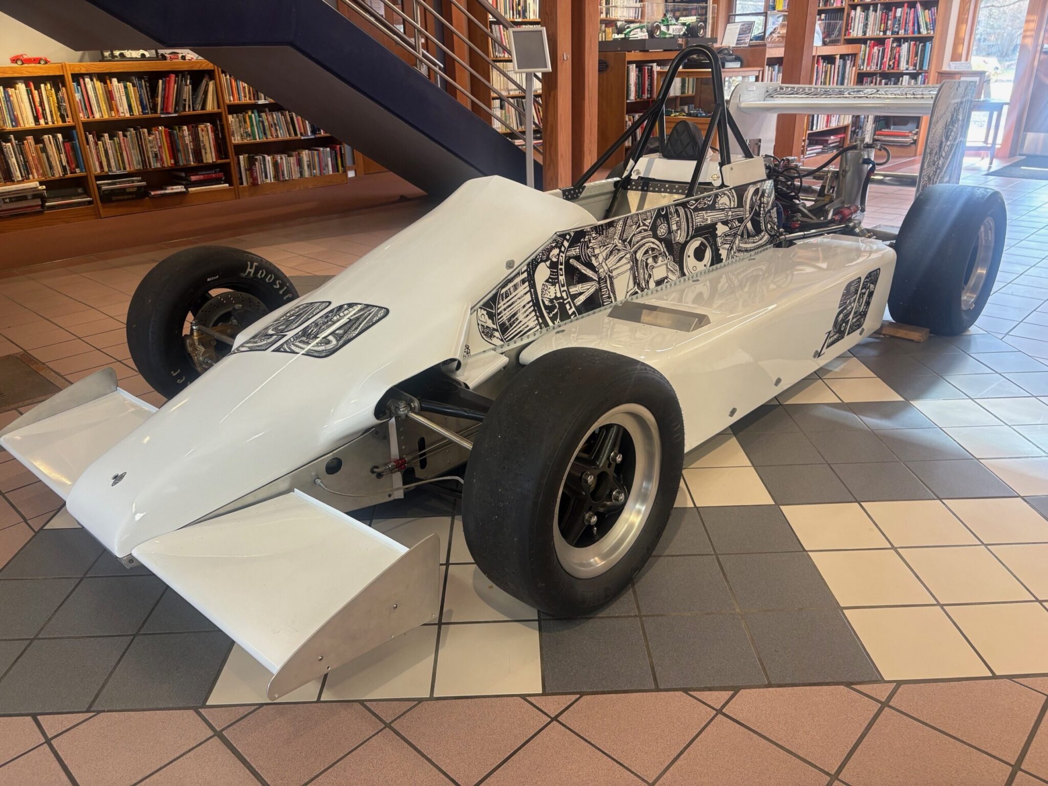 When the founders of the International Motor Racing Research Center were working on the details for the new archival and research facility they knew they wanted the look and feel of a library. Some exhibit space was important, and, foremost, they envisioned space for a race car. Wide double doors have accommodated the rolling in and out of dozens of different cars since the IMRRC opened in June 1999. The cars are displayed for a few months, often complementing a Center Conversations talk or another event.