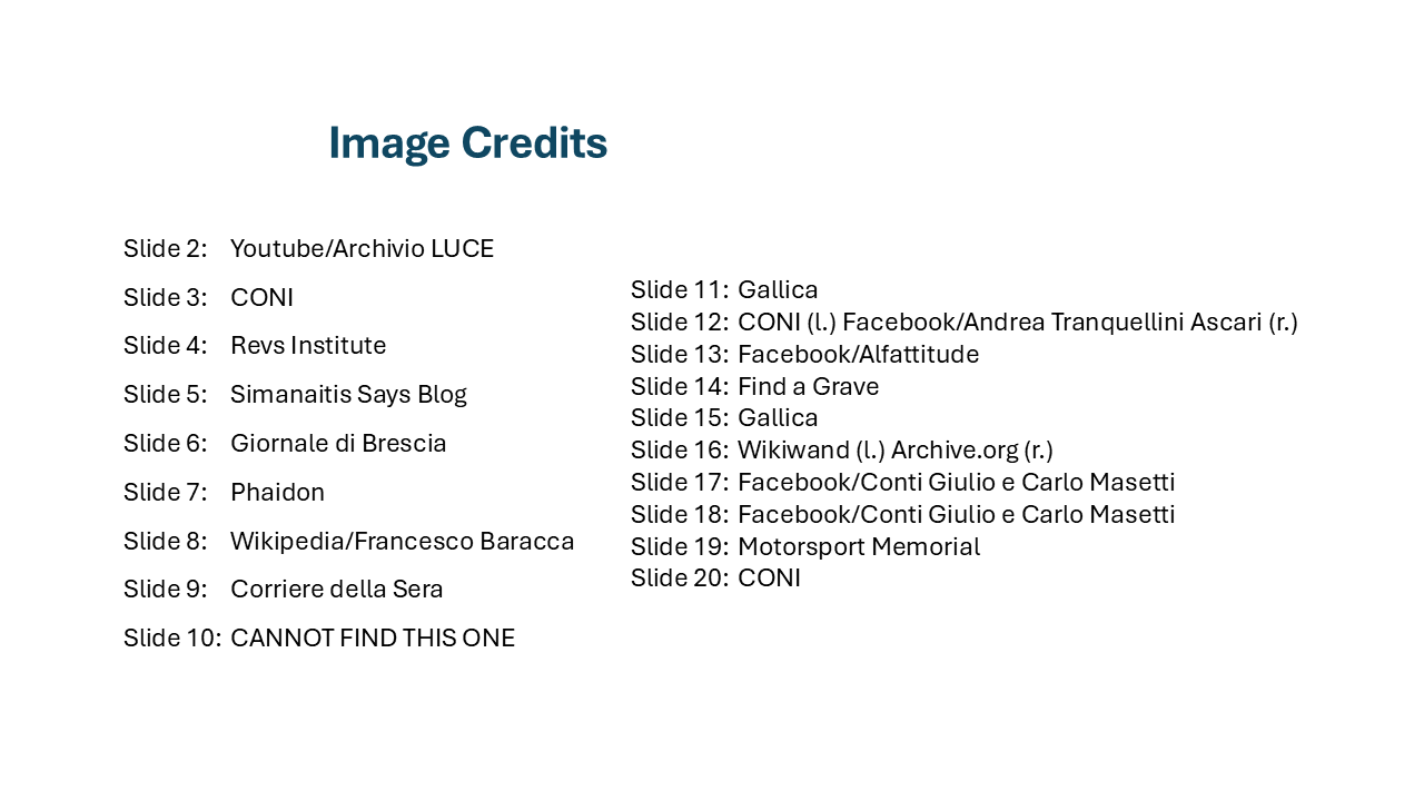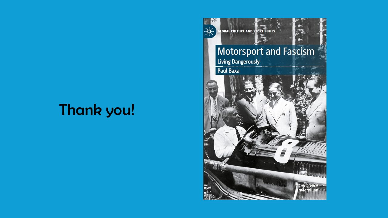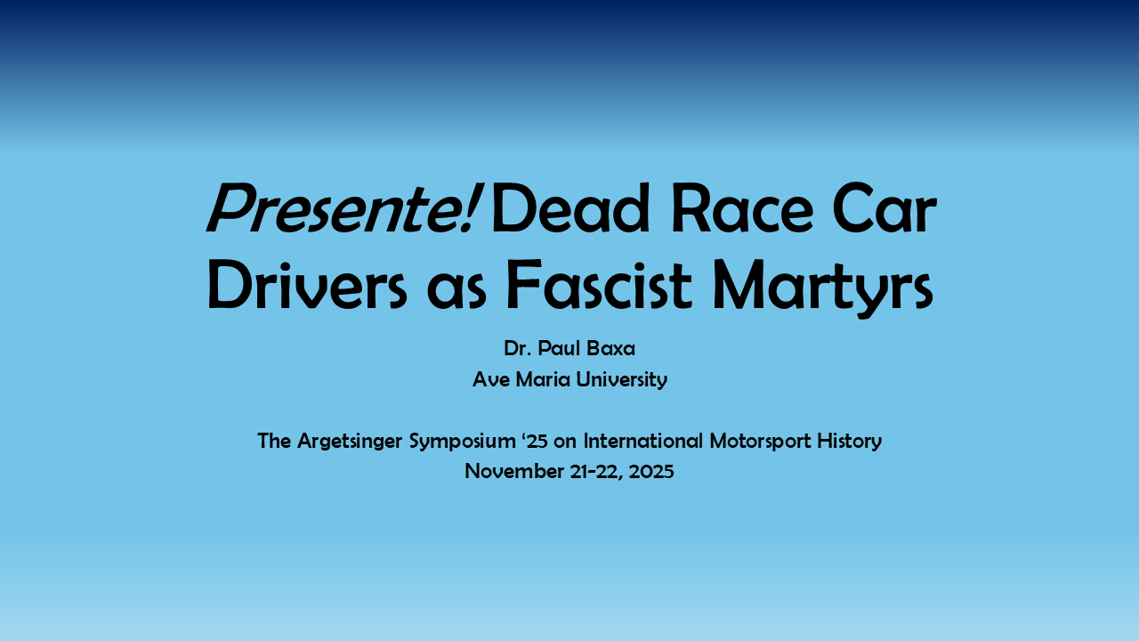 The postwar era of Grand Prix racing was notable for the high number of Italian racers killed in accidents. Yet little attention has been paid to the role of racing “martyrs.” This presentation will examine how the Italian Fascist regime presented dead drivers as martyrs to several causes.
