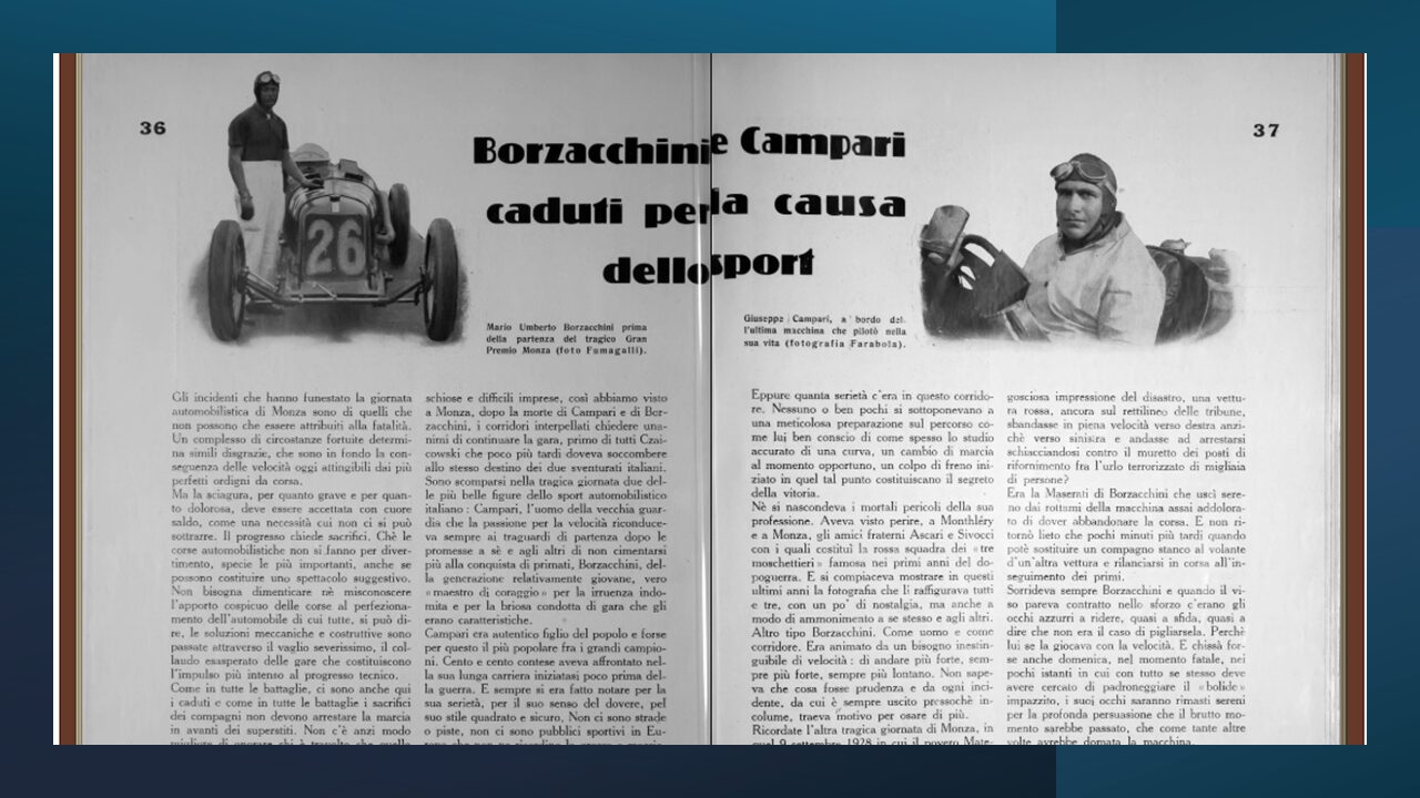 These causes were (1) the progress of national industry; (2) the triumph of Italian sporting achievements on an international scale, and (3) Fascism’s project of building a new civilization based on speed and daring. As Dr. Baxa will argue, inspired by Friedrich Nietzsche’s dictum to “live dangerously,” the Fascist regime turned tragedies into transcendent moments.