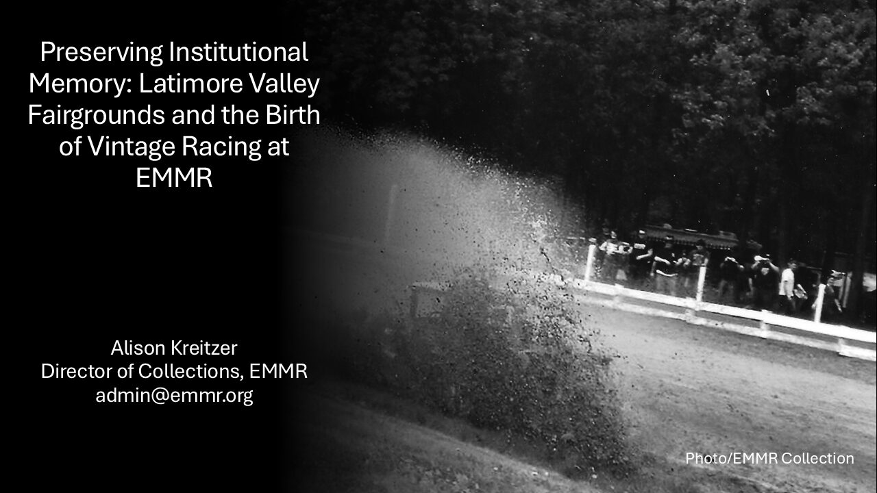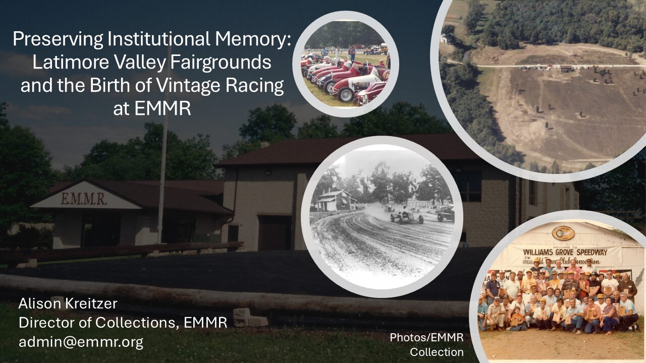 Drawing on archival records, oral histories, and community recollections, the presentation will trace the fairgrounds’ early role in regional motorsports and its subsequent decline. The narrative then shifts to the 1980s, when members of EMMR revived the dormant track, reimagining it as one of the nation’s first dedicated vintage race car exhibition tracks. This groundbreaking effort not only safeguarded the physical site but also transformed Latimore Valley into a dynamic venue where history is experienced through live demonstrations.